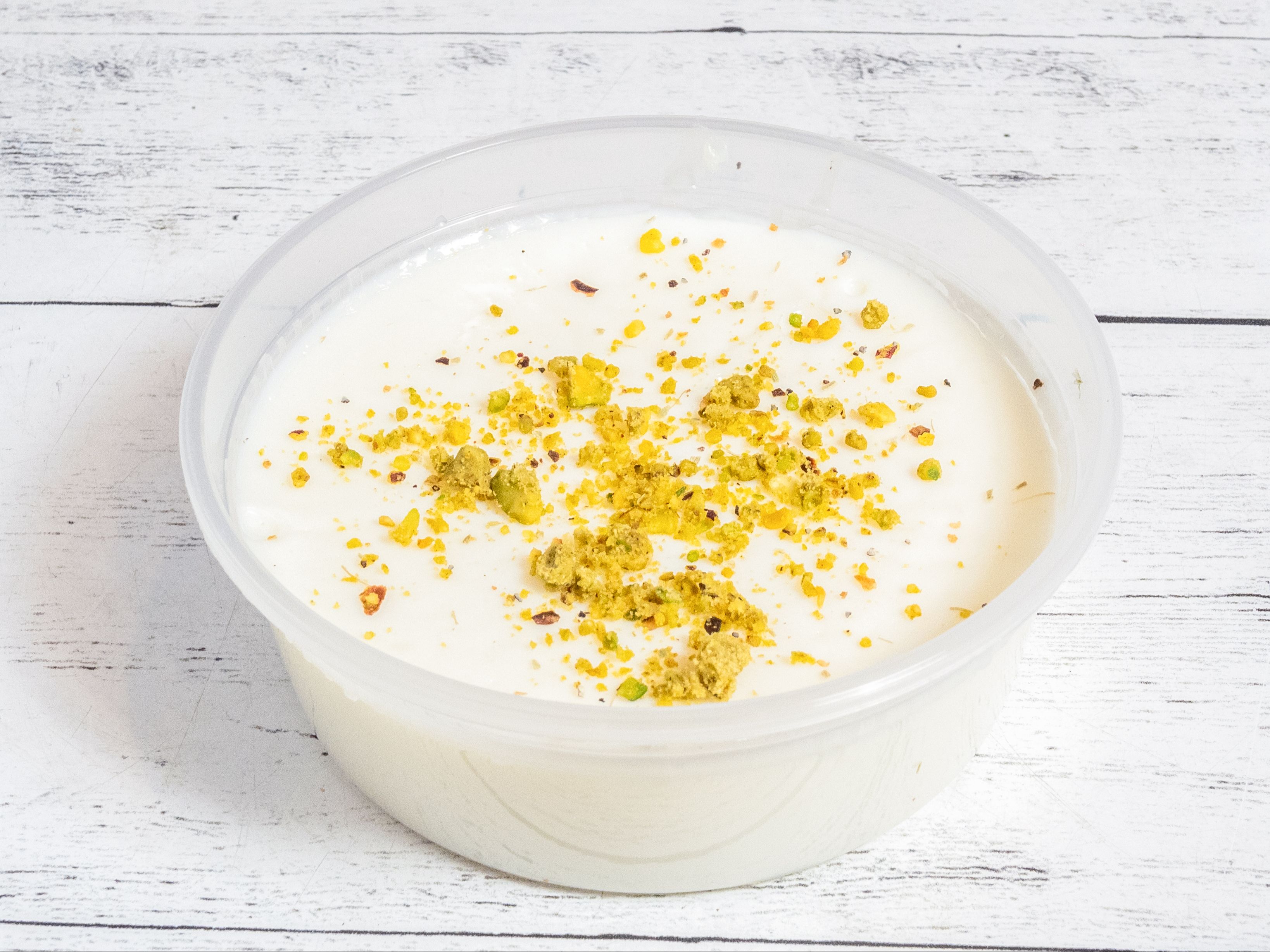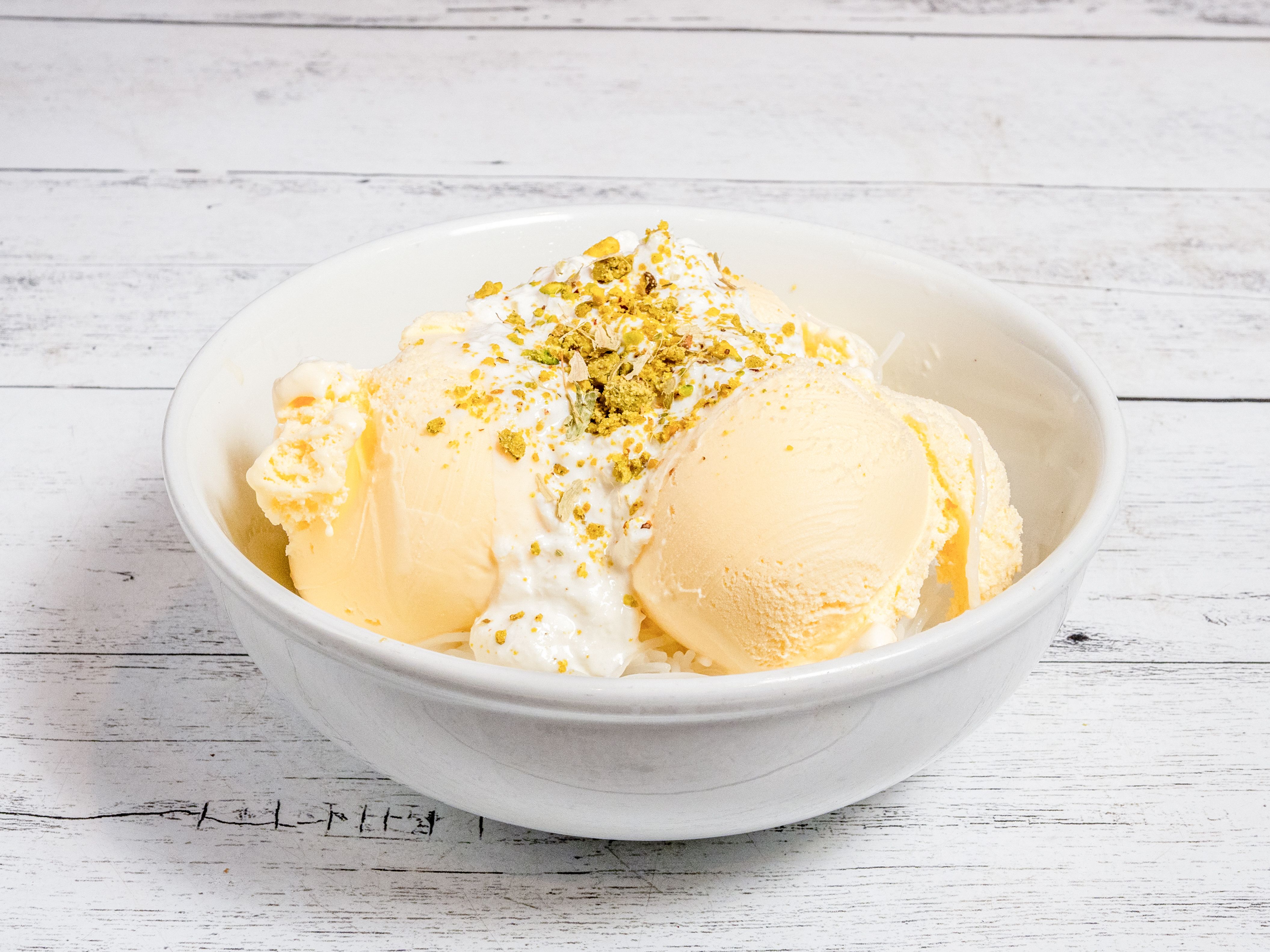 Shaved ice topped with rice noodles, syrup, vanilla ice cream, heavy cream, rose water, cardamom and pistachio.