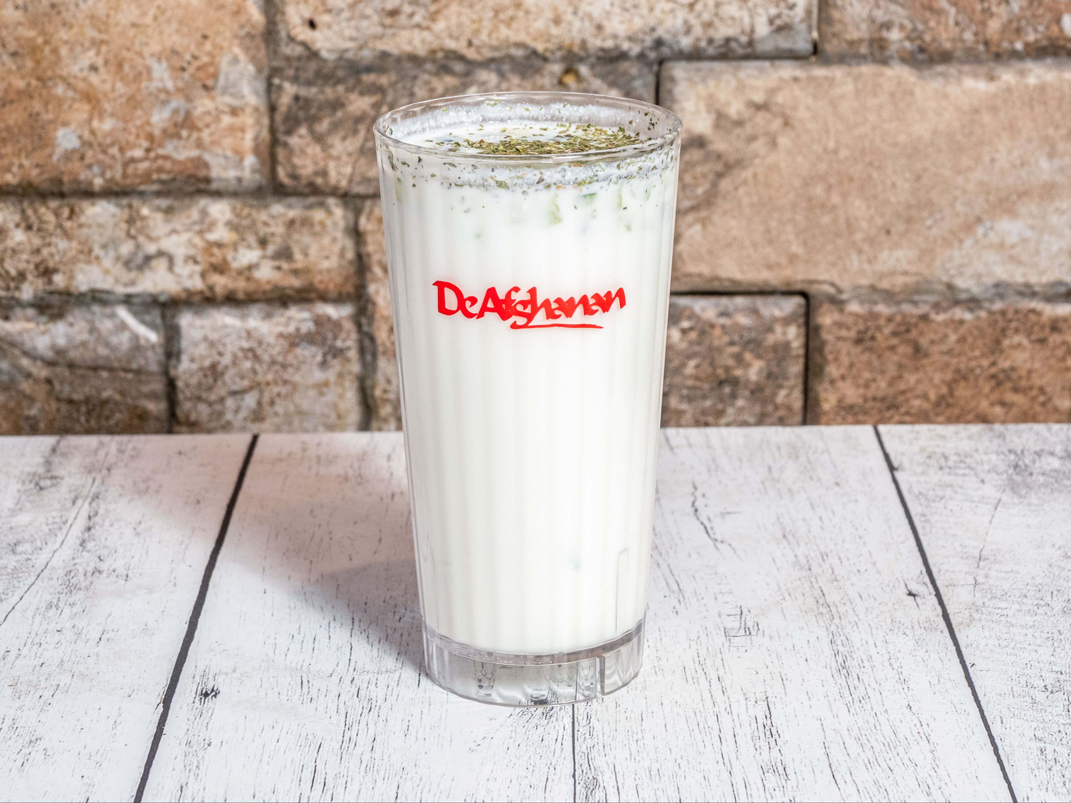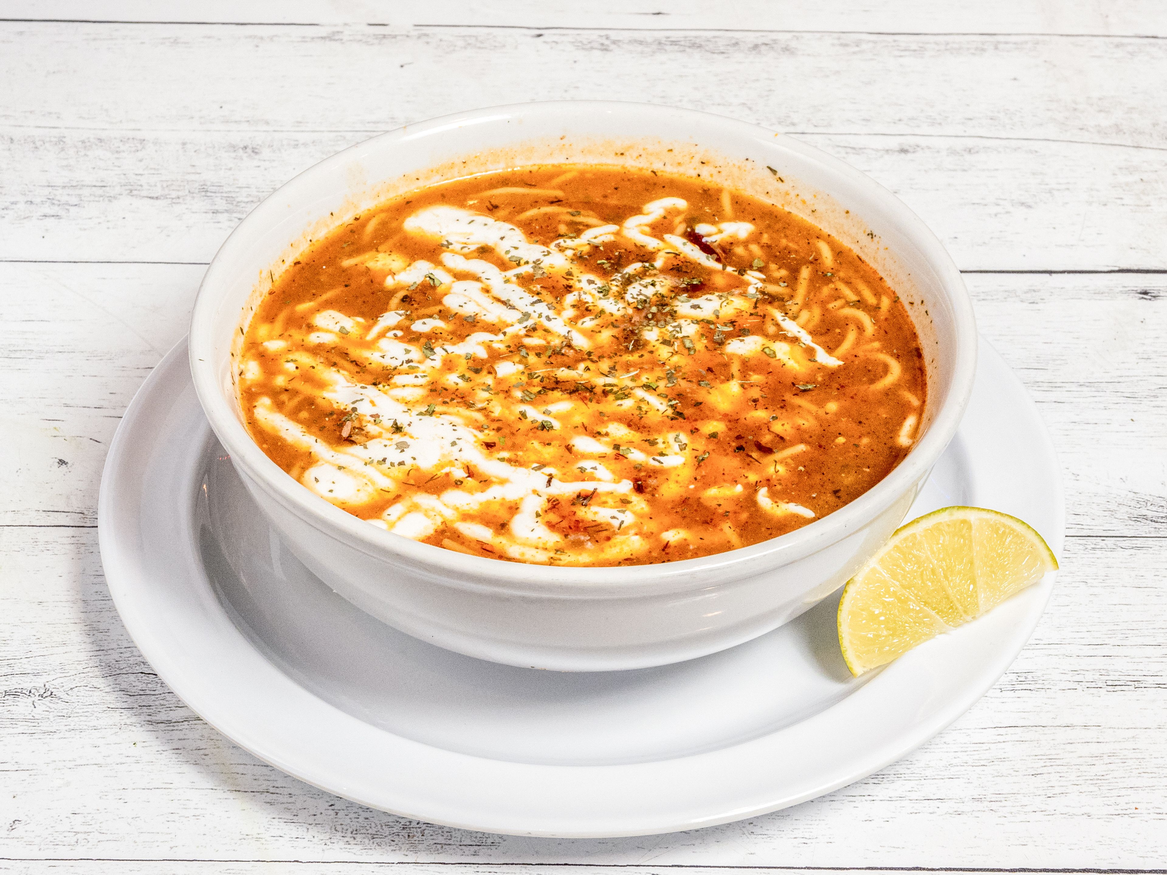Authentic afghan noodle soup topped with yogurt and dried mint.