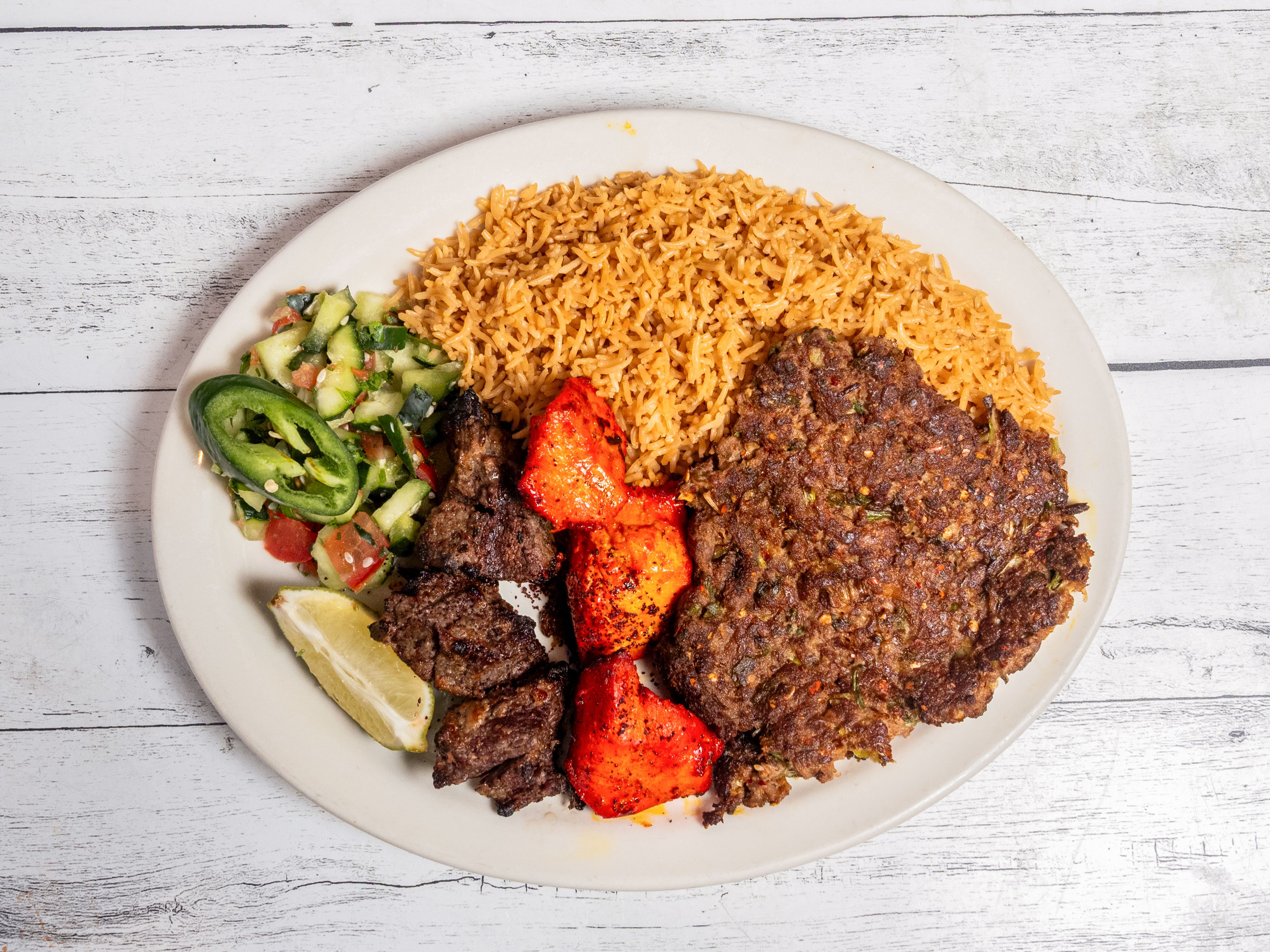 Chicken and beef kabob infused with our homemade marinade along with a grilled ground sirloin patty mixed with scallions, crushed red pepper and seasonings.
