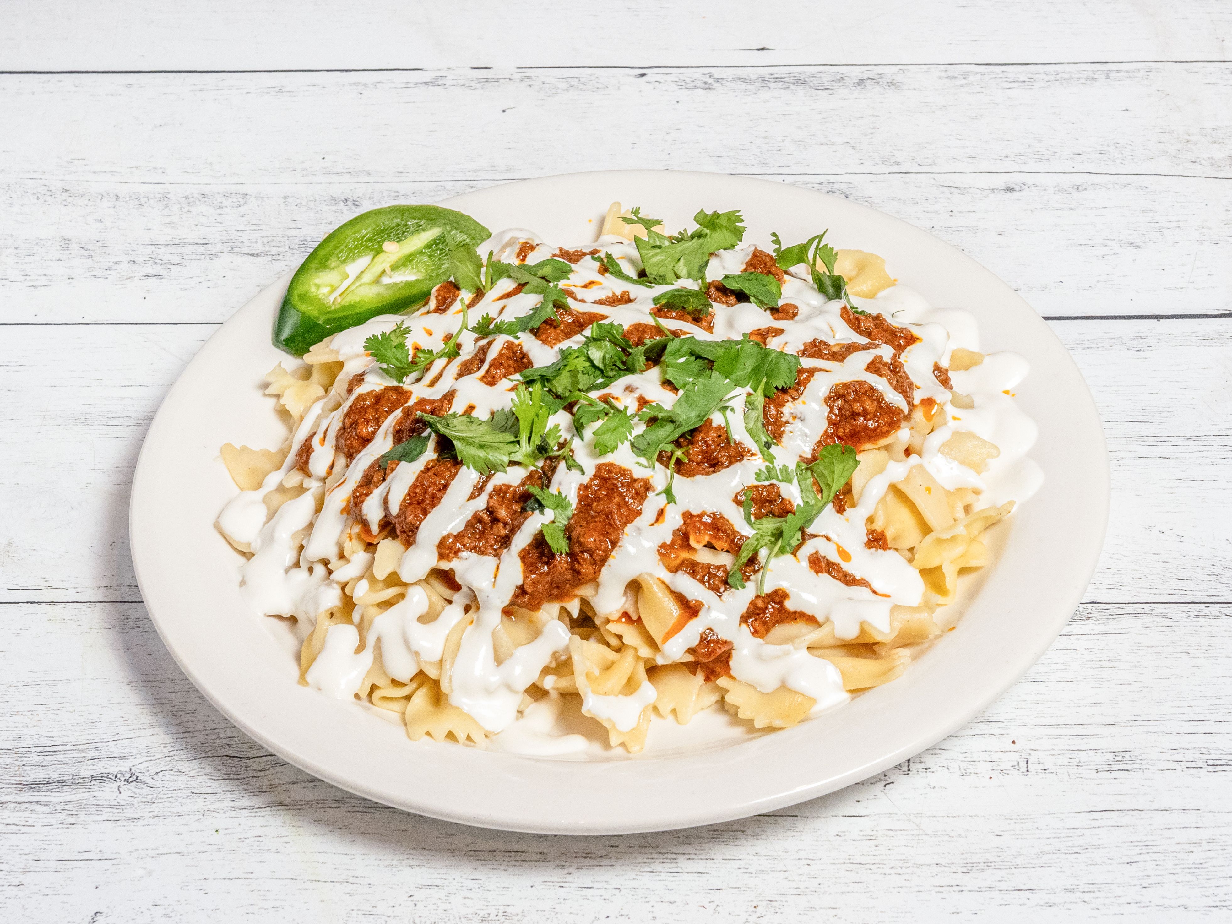 Pasta filled with ground beef, onions, garlic and spices topped with a vegetable sauce, garlic sour cream and dried mint.