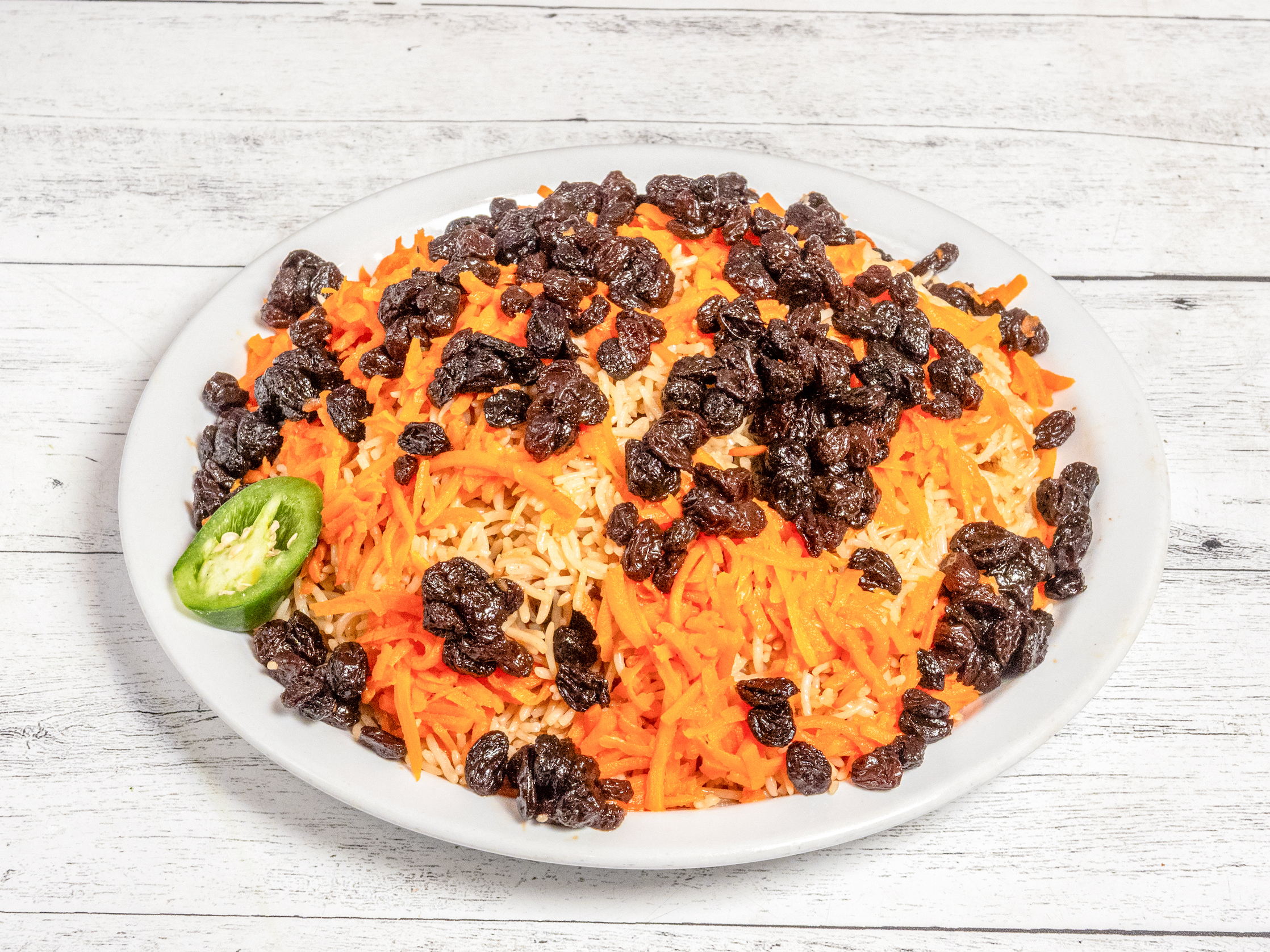 A lamb shank buried in brown rice topped with carrots and raisins served with Afghan bread.