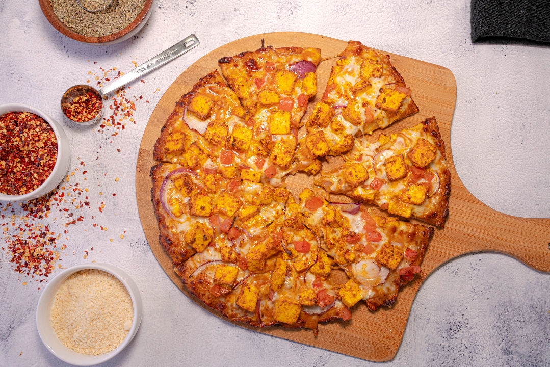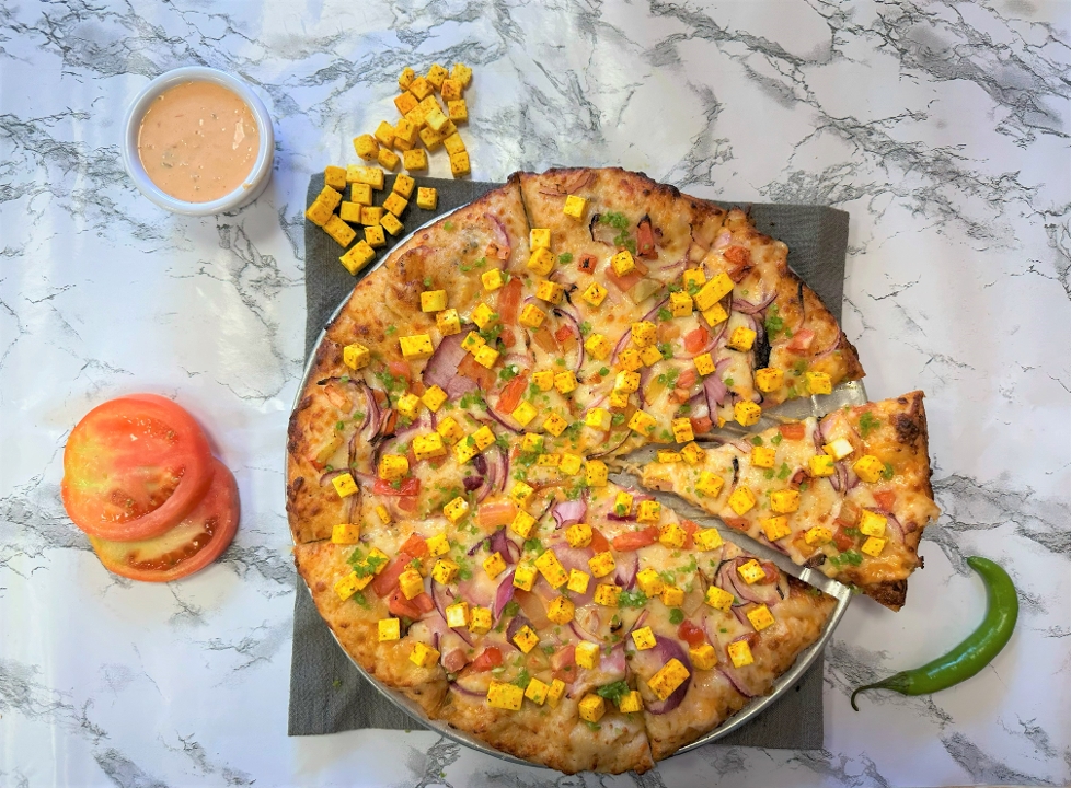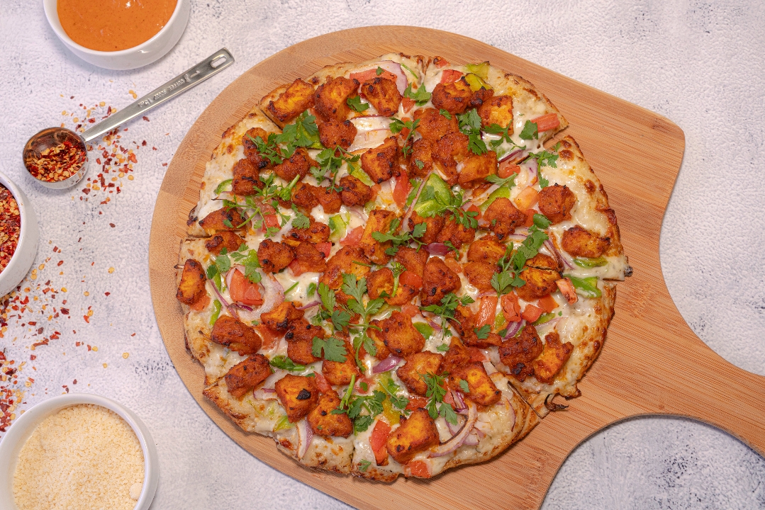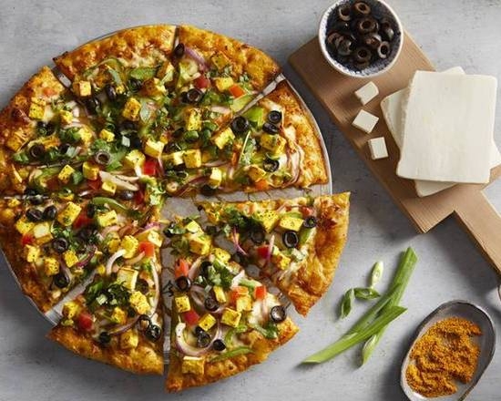 Jain red sauce, mozzarella cheese, green bell peppers, diced tomatoes, paneer and fresh cilantro
