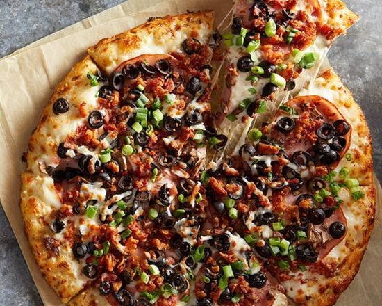 White garlic sauce, cheese, ham, mushroom, black olive, bacon, green onion