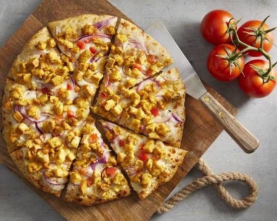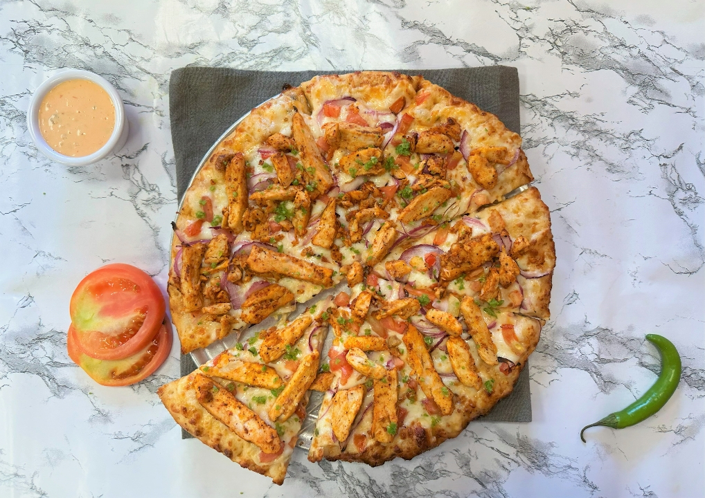 Malai Sauce, Cheese, Red Onions, Tomatoes, and Marinated Chicken