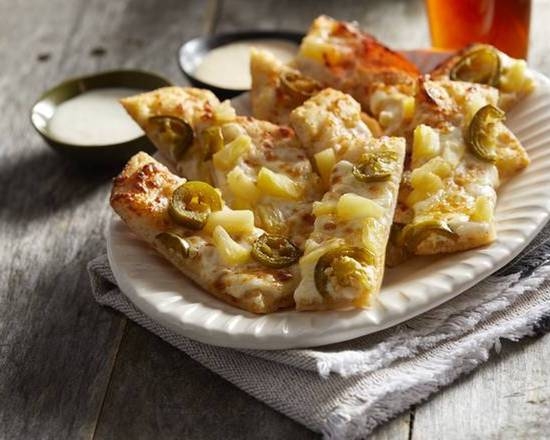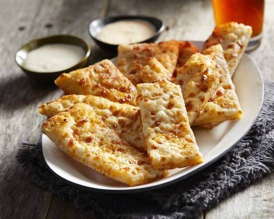 Garlic breadsticks topped with cheese and served with two sides of ranch.