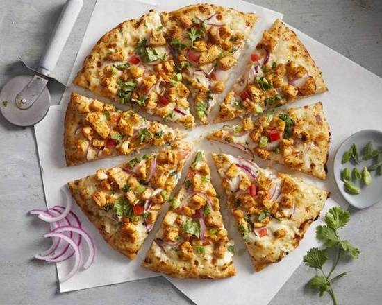 White garlic sauce, cheese, bell pepper, red onion, diced tomatoes, tandoori chicken, cilantro