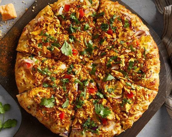 Curry sauce, cheese, bell pepper, red onion, diced tomatoes, masala paneer, green onion, cilantro