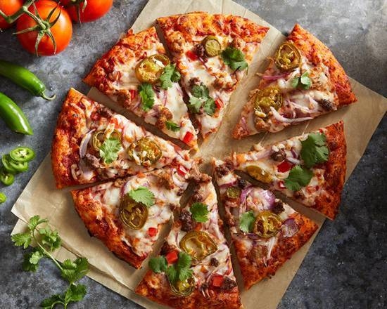 House red sauce, cheese, red onion, diced tomatoes, jalapenos, beef, sausage, cilantro