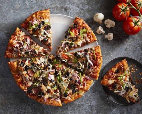 House red sauce, cheese, mushroom, bell pepper, red onion, diced tomatoes, black olive, artichoke
